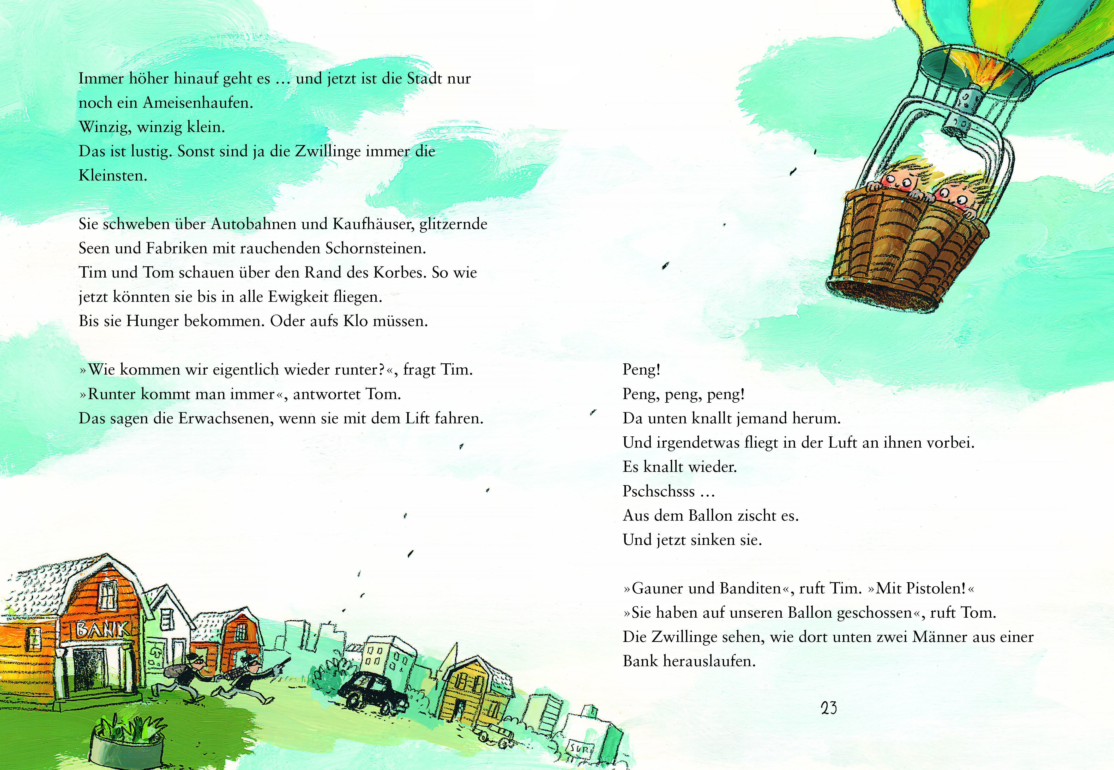 Die Welt kann wirklich froh sein, dass es Tim und Tom gibt! Diese beiden blonden Strubbelköpfe, wie ihr Papa sie herzlich nennt, vollbringen eine gute Tat nach der anderen. Sie retten eine kranke Fliege und einen vermeintlich ausgesetzten Dackel, schnappen Diebe, hüten Schafe – und für ihren grippekranken Papa gehen sie sogar zur Arbeit. Dass sie dabei immer wieder großes Chaos stiften, na ja, das gehört dazu …