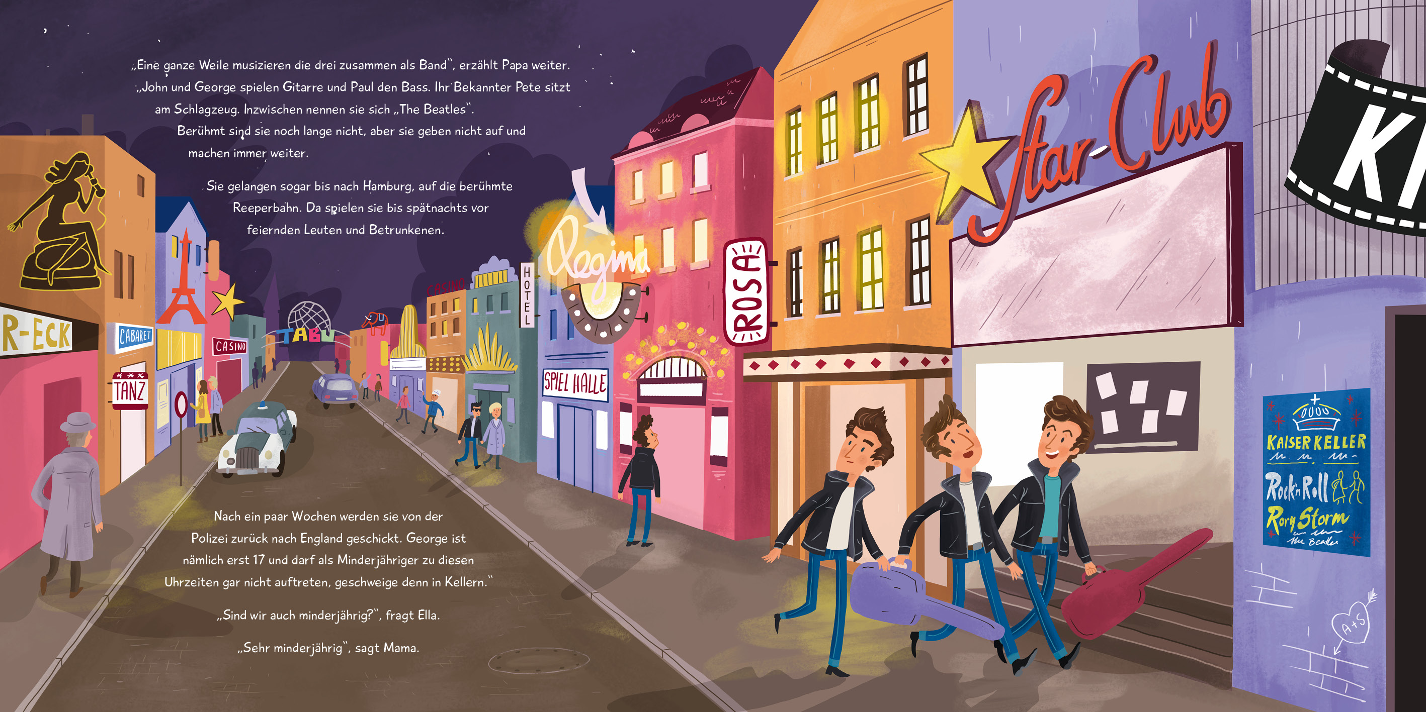 Ella und ihr kleiner Bruder Ben lieben Musik – genau wie ihre Eltern. Heute holt Papa eine alte Schallplatte aus dem Schrank und erzählt den beiden von vier Jungs aus Liverpool, der erfolgreichsten Band aller Zeiten. Ella und Ben begeben sich auf eine Zeitreise in die wilden 1960er und zugleich auf eine Fantasiereise zu gelben U-Booten, Unterwassergärten und Erdbeerfeldern.