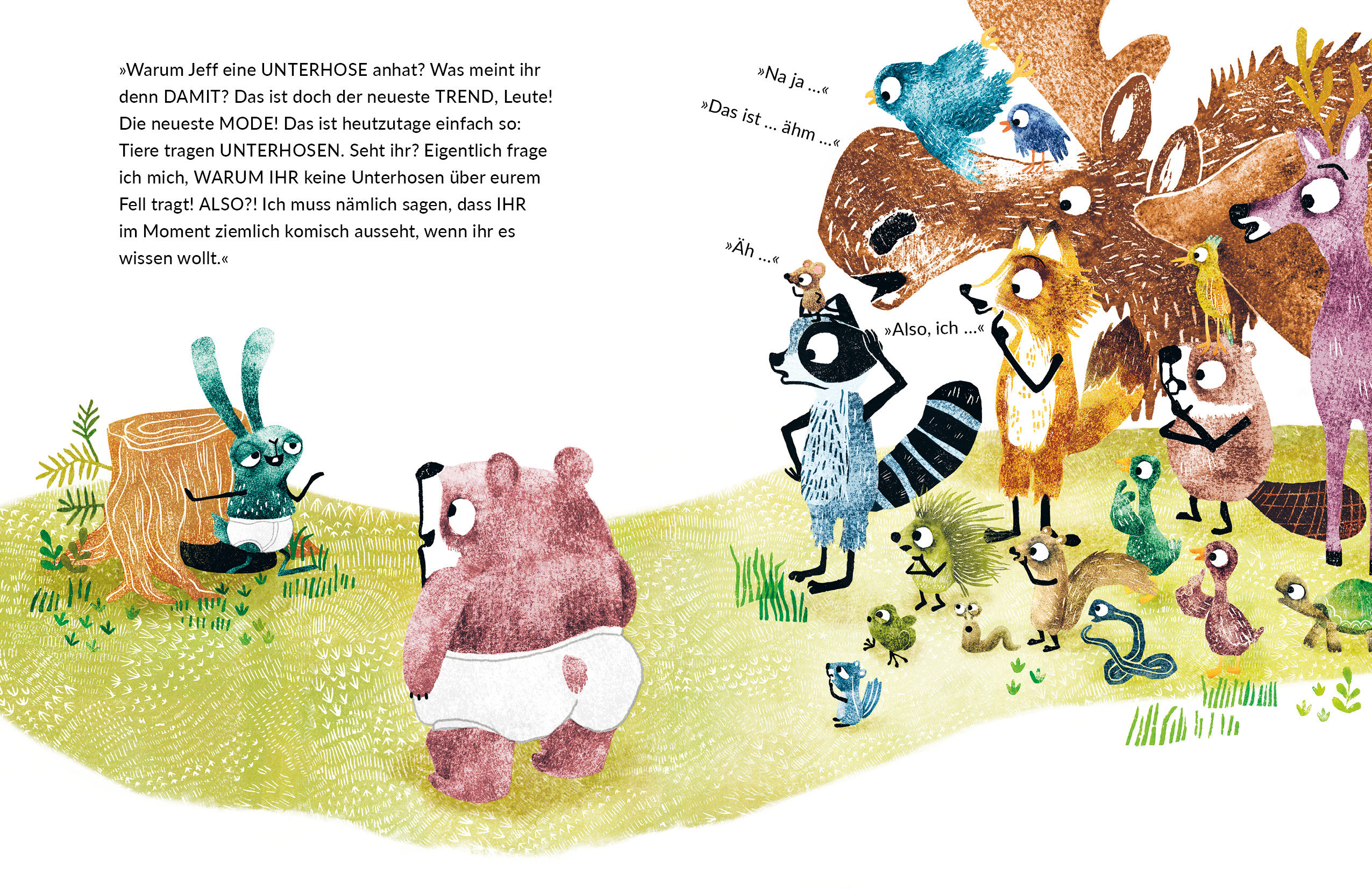 Jeff, der Bär, hat das Gefühl, dass heute irgendetwas komisch ist. Bloß was? Auch alle anderen Tiere sehen ihn so komisch an. Was stimmt denn nur nicht? Zum Glück ist sein bester Freund Anders zur Stelle: Jeff hat tatsächlich etwas vergessen. Er trägt noch seine Unterhose über dem Fell! O nein, wie peinlich, sein guter Ruf ist dahin. Zum Glück übersteht man mit einem besten Freund selbst Unterhosen-Tage. Und so wird im Wald von Jeff und Anders ein neuer Modetrend geboren: Unterhosen über dem Fell zu tragen ist plötzlich hip! Auf gute Freunde kann man sich eben immer verlassen, ein bisschen so wie auf eine Lieblingsunterhose …