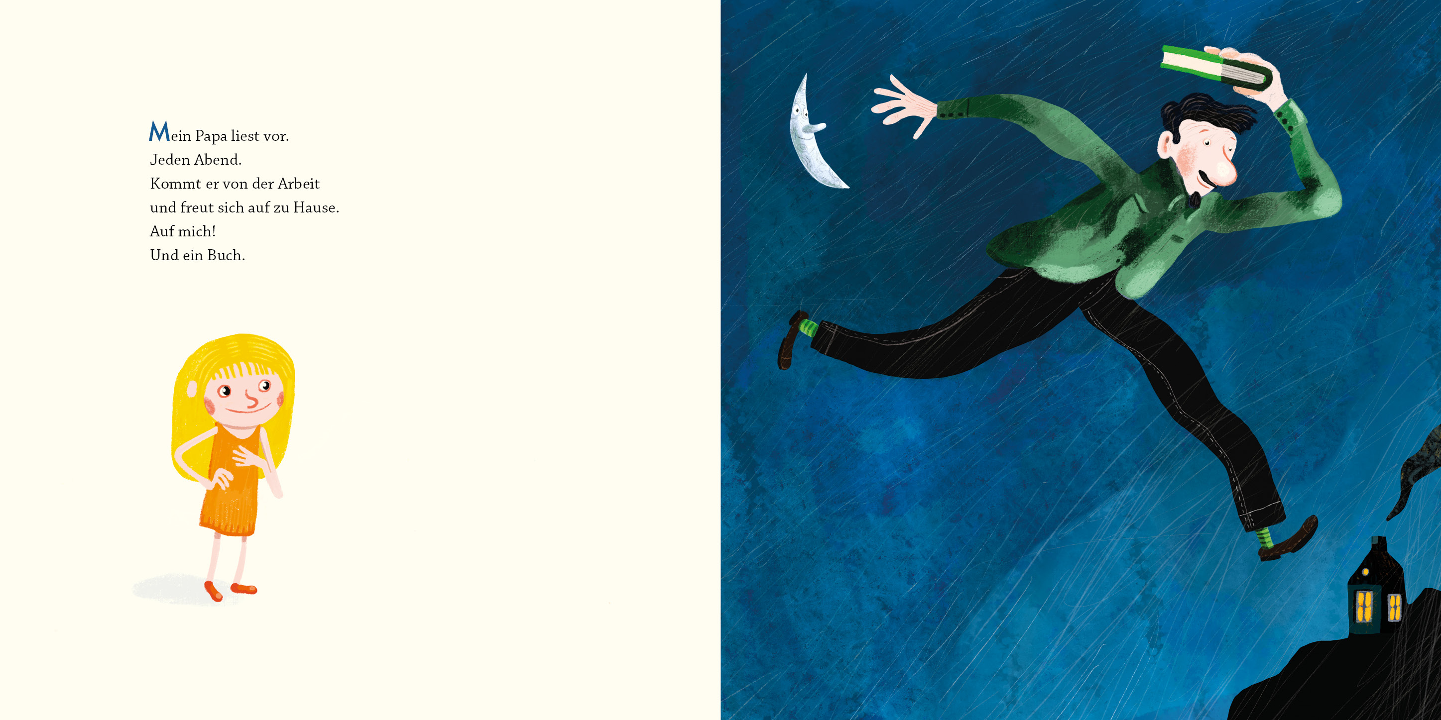 Papa liest immer und überall vor. Selbst auf dem Spielplatz oder morgens auf dem Weg zur Schule. So wird der Alltag schnell zum Abenteuer.