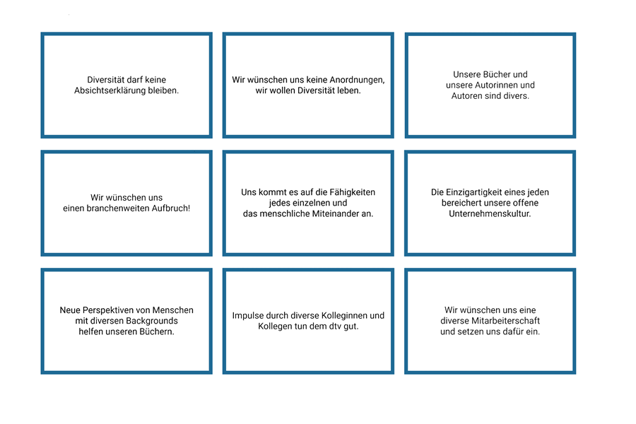 In unserer Diversitätsumfrage haben dtv-Mitarbeiter*innen ihre persönlichen Perspektiven geteilt – offen, ehrlich und inspirierend.Unserer Inklusionsvertreterin und unsere Schwerbehindertenvertreterin sind für alle Kolleginnen und Kollegen jederzeit erreichbar und bringen die Themen Inklusion und Diversität in persönlichen Gesprächen, einem Newsletter und Mitarbeitertreffen in den dtv mit ein. Mentale Ersthelfer kümmern sich in psychischen Krisensituationen.